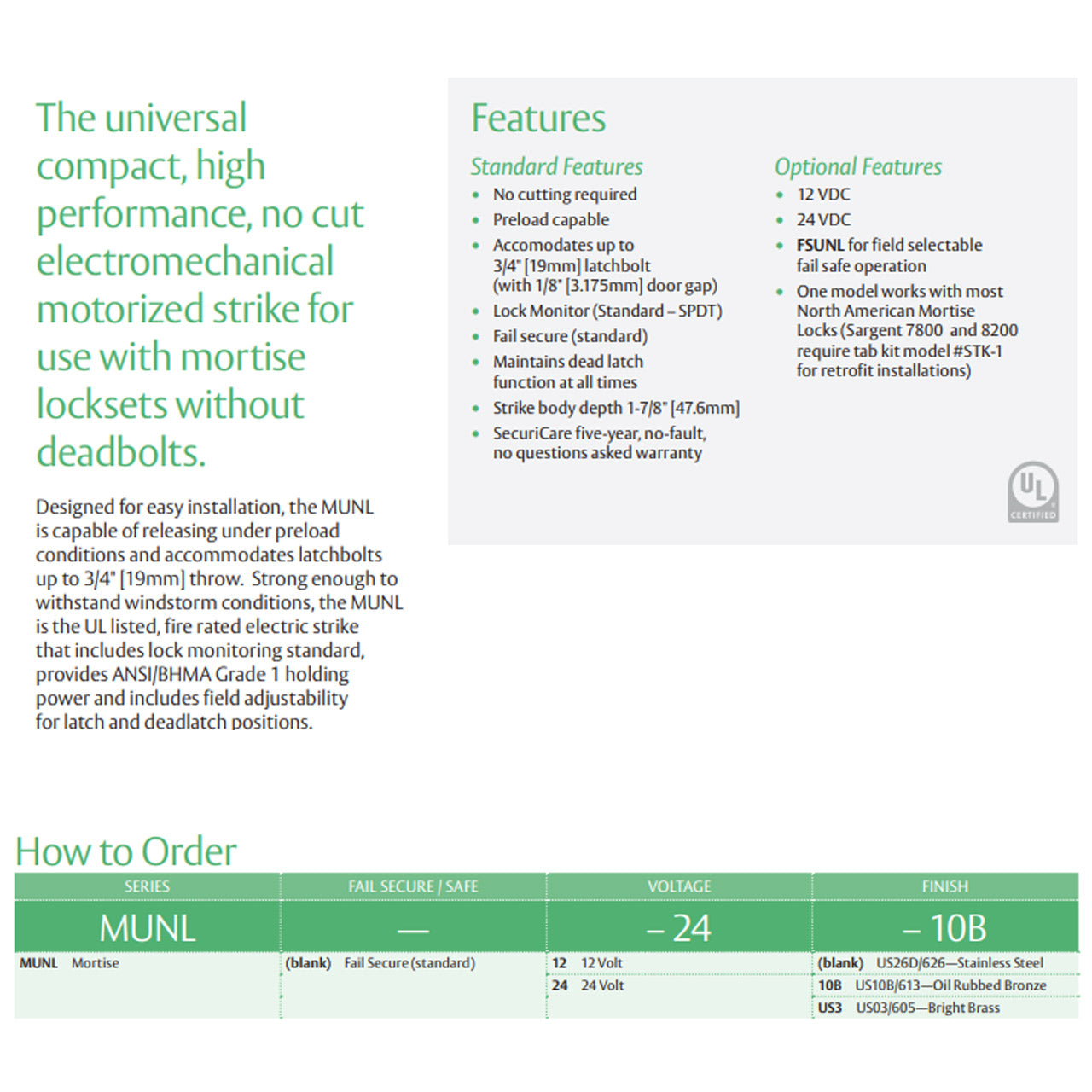 Designed for easy installation, the Securitron MUNL is capable of releasing under preload conditions and accommodates latchbolts up to 3/4" [19mm] throw. Strong enough to withstand windstorm conditions, the Securitron MUNL is the UL listed, fire rated electric strike that includes lock monitoring standard and includes field adjustability for latch and deadlatch positions.