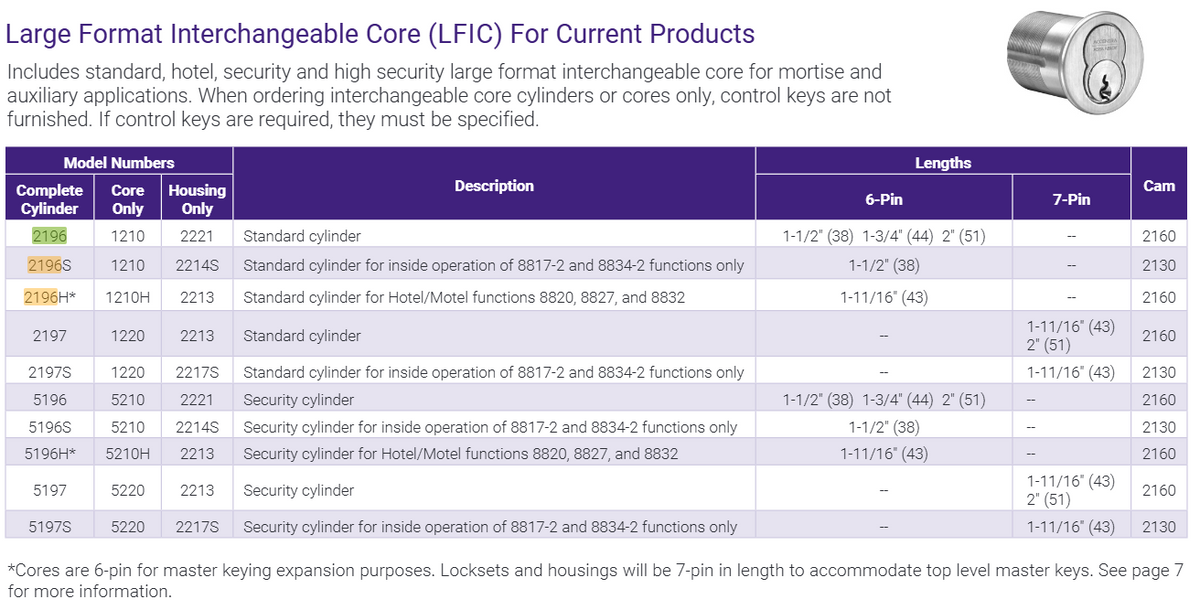 LFIC Mortise Cylinder with Core, 6 or 7 Pin, 2160 Cam