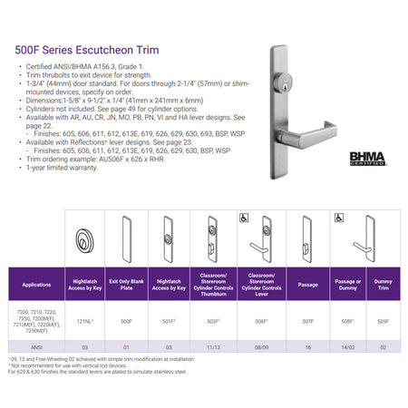 Upgrade your exit device system with the 500F Series Escutcheon Trim—engineered for ANSI/BHMA A156.3, Grade 1 durability and refined with a selection of premium lever styles and finishes. Designed for strength, reliability, and compatibility, this trim series offers versatile functionality for commercial spaces demanding both form and function.