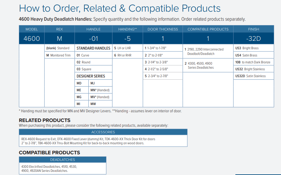 REX-4600 Request to Exit, DTK-4600 Fixed Lever (dummy) Kit, TDK-4600-XX Thick Door Kit for doors 2” to 2-7/8”, TBK-4600-XX Thru-Bolt Mounting Kit for back-to-back mounting on wood doors. |