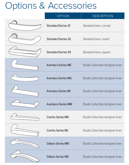Standard series lever styles (-01, -02, -03) are designed to return within 1/2” [12.7 mm] of the door face, often required by code. Please verify local code requirementsto ensure compliance.