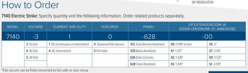 Strike Lip: Basic strike has lip of proper length for 1-3/4" [44.5 mm] thick door that closes flush with jamb edge. Where door thickness or jamb shape differs from this standard relationship, lip extension kits are available, specified by last dash number.