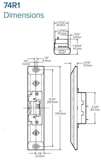 74R1: 5/8" x 1-7/16" x 9/16" deep [15.9 mm x 36.5 mm x 14.3 mm deep]. Strike accepts Pullman latch of exit devices without deadlocking bolts.