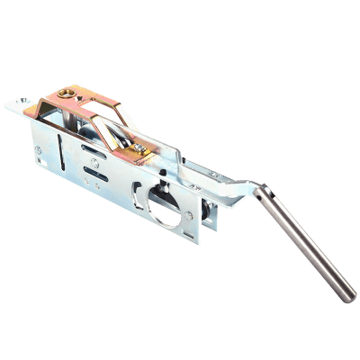 The MS1861 lies horizontally in the bottom rail of ultra-narrow stile doors which have insufficient vertical space for a lock, or tempered glass doors which have no stile at all. The hardened steel cylindrical bolts allow simple drilled strike holes of a relatively small size to minimize the nuisance and danger presented by some threshold strikes in collecting debris or snagging on high-heeled shoes. MS1861-02 locks either single-leaf or pairs of doors. Not recommended for wood doors.