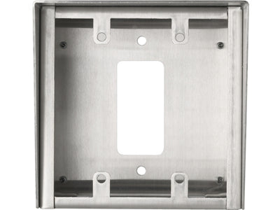 A surface mount stainless steel enclosure designed for mounting Aiphone 2-gang sub stations. The enclosure is weather resistant and includes space inside for wiring. The unit mounts to a 1-gang box or ring, or mounts directly to a wall surface