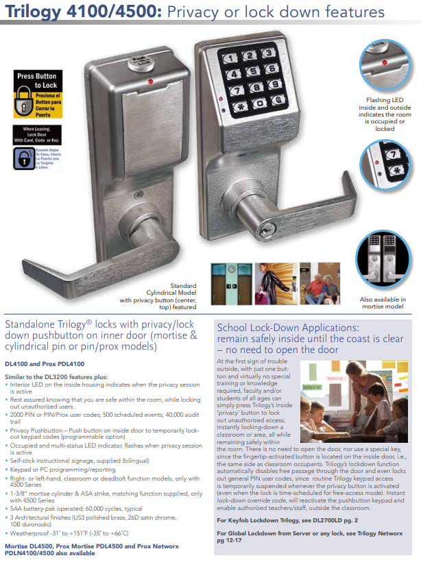 Privacy Pushbutton – Push button on inside door to temporarily lockout keypad codes (programmable option)