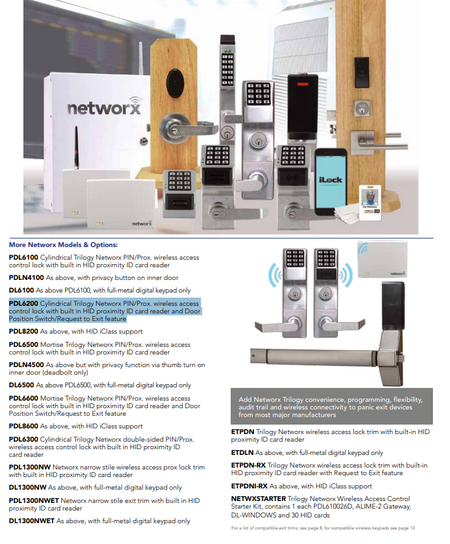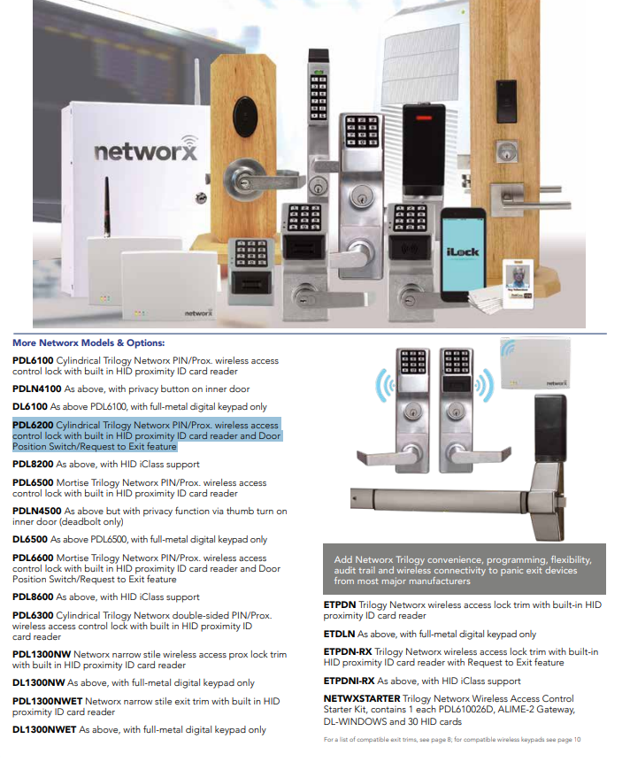 Trilogy Networx Locks communicate wirelessly via Ethernet or 802.11B/G for a comprehensive wireless networked door access control system, eliminating door-to-door programming and audit trail retrieval and providing all standalone Trilogy lock functionality plus new network-wide global emergency lockdown/unlock commands