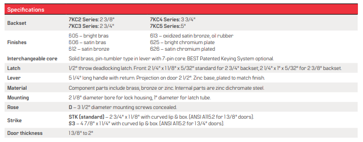 The BEST 7KC Series, a Grade 2 cylindrical lever set, is a popular choice for commercial office spaces, college dorms and military bases. This medium-duty cylindrical lock fits a standard door prep. And because it’s comparable to the BEST 9K lever set, it’s been specified at times for heavy-duty residential applications.