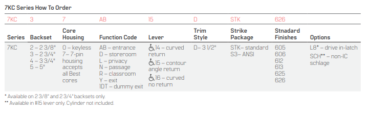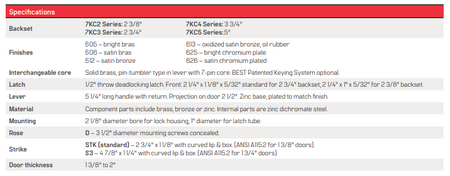 Backset – 7KC2 Series: 2 3/8", 7KC3 Series: 2 3/4", 7KC4 Series: 3 3/4", 7KC5 Series:.5"