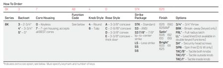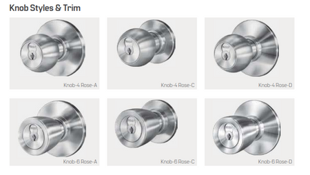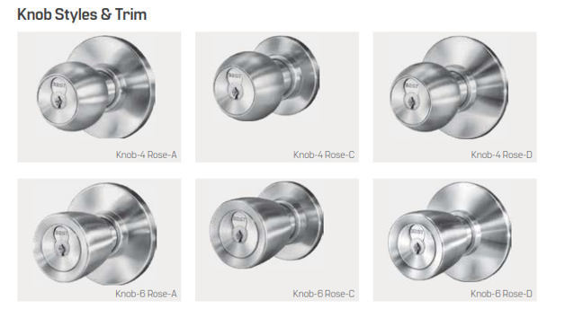 Options: KNL– Knurl keyed knob, L8– drive in-latch. Roses: C– 2 9/16" Dia. D– 3 3/8" Dia. Mounting screws concealed.