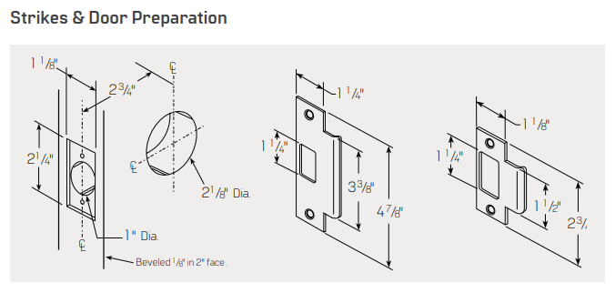 Strike: STK (standard)– 2 3/4" x 1 1/8" with curved lip & box (ANSI A115.2 for 1 3/8" doors). S3– 4 7/8" x 1 1/4" with curved lip and box (ANSI A115.2 for 1 3/4" doors).