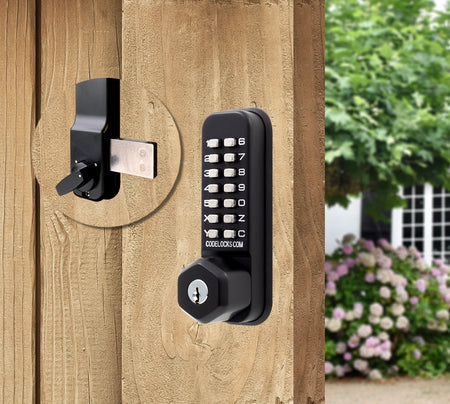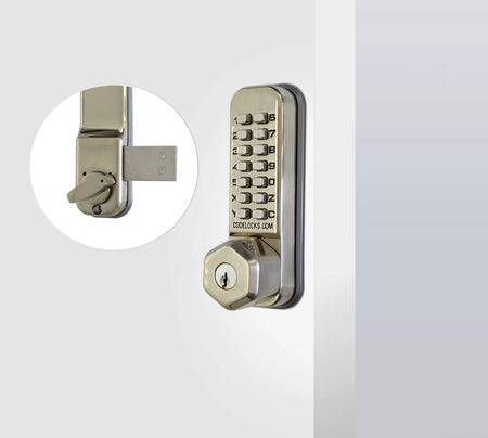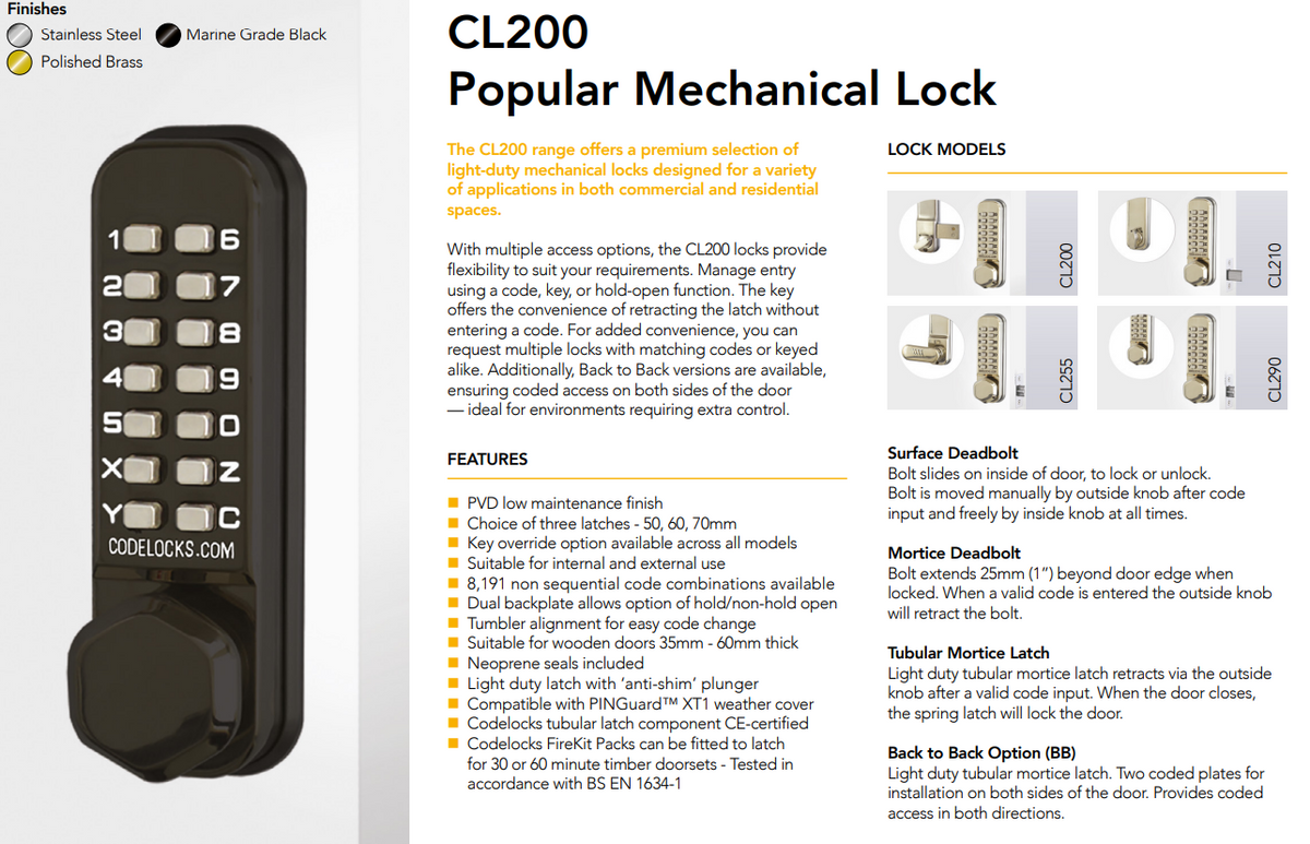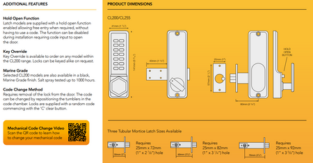 Premium light duty mechanical lock with surface deadbolt and key override option. Bolt is moved manually by outside knob after code input and freely by inside knob at all times. Key override is available to order on compatible models within the CL200 range. Locks can be keyed alike on request.