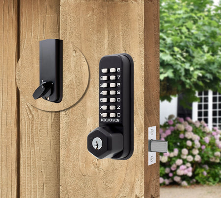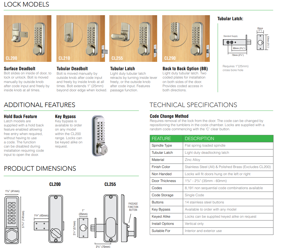 Bolt is moved manually by outside knob after code input and freely by inside knob at all times. Bolt extends 25mm (1”) beyond door edge when locked. Key override is available to order on compatible models within the CL200 range. Locks can be keyed alike on request.