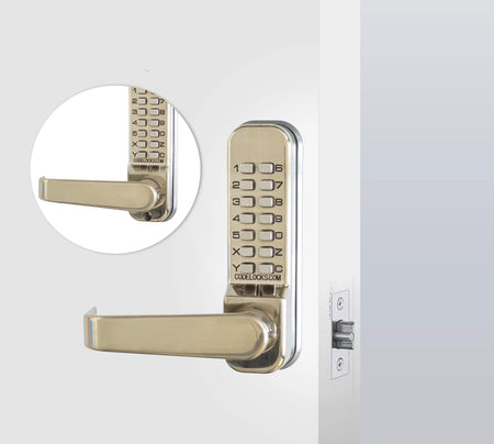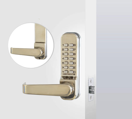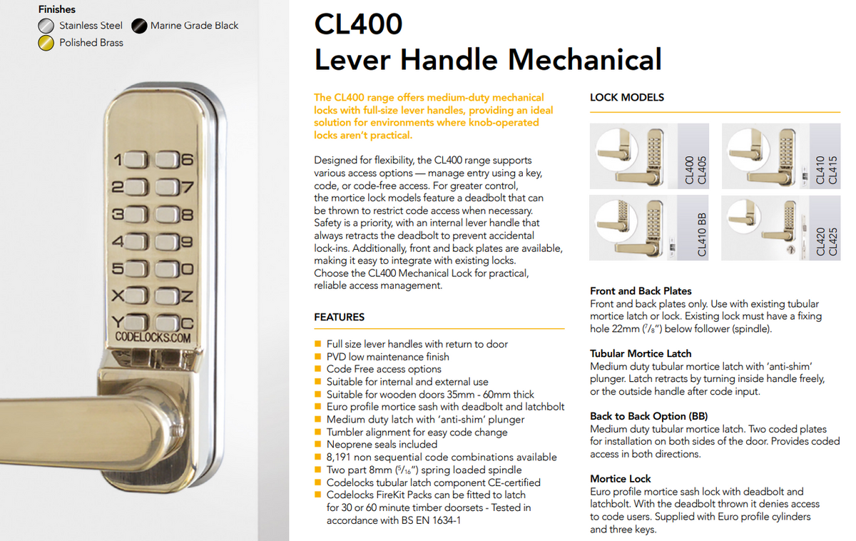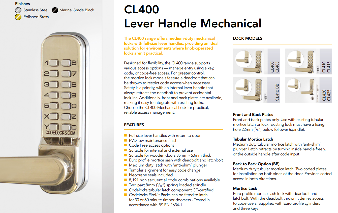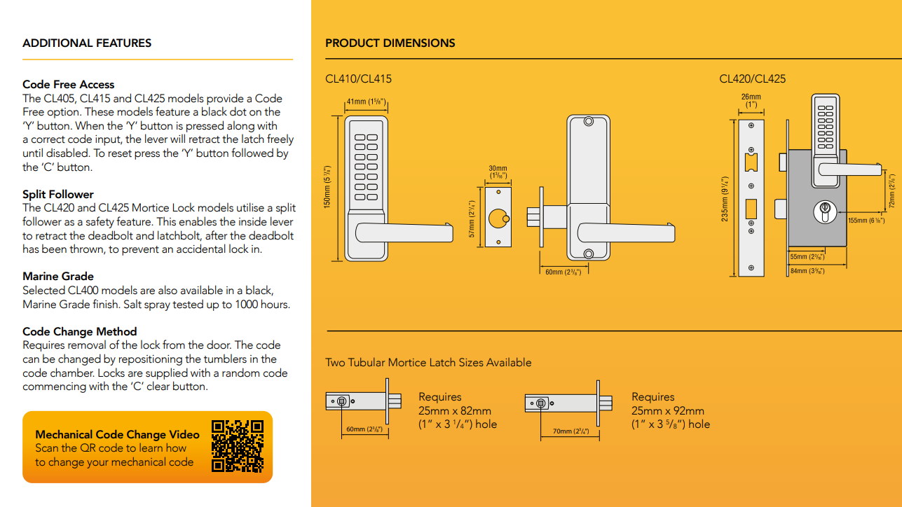 Medium duty mechanical locks with full size lever handles. Ideal for use in environments where a knob operated lock would be unsuitable. Tubular latch with ‘anti-shim’ plunger. Latch retracts by turning inside handle freely, or the outside handle after code input. The CL415 model provides a Code Free option. This model features a black dot on the ‘Y’ button. When the ‘Y’ button is pressed along with a correct code input, the lever will retract the latch freely until disabled.