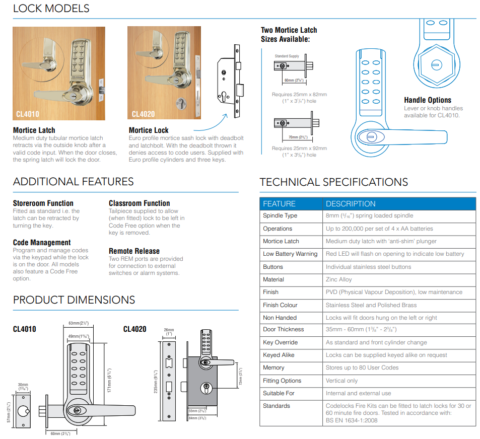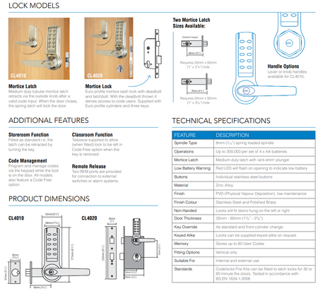 The CL4010 lock is of a stylish and contemporary design. Fully programmable on the door via the keypad with a multiple range of functions making them particularly suitable for use in health, educational, commercial and residential environments. Medium duty tubular latch retracts via the outside knob after a valid code input. When the door closes, the spring latch will lock the door.