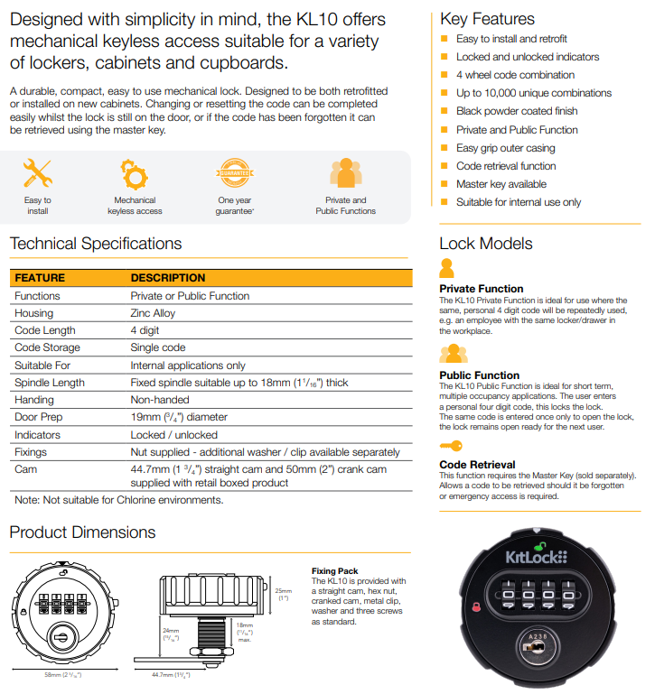 Designed with simplicity in mind, the KL10 offers mechanical keyless access suitable for a variety of lockers, cabinets and cupboards.