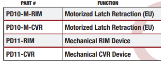 The Command Access PD10-M series is a motorized latch pullback Grade 1 storefront exit device that refrofits First Choice 3600/3700 & Dor-o-matic 1600/1700 series. All PD10-M models are equipped with our PTS “push to set” technology. We know that door conditions change and in retrofit scenarios you never know exactly what you’re walking into. But with our 1 Touch PTS adjustment your post installation adjustment is a breeze. Install this device with the confidence of knowing that the PD10-M meets or exceeds the high standards of other grade 1 products and carries our 3-year “no hassle “ warranty