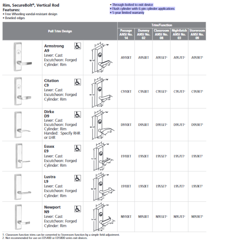 Through-bolted to exit device Flush cylinder with 6-pin cylinder applications 5-year limited warranty