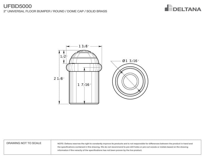 Deltana UFBD5000 Round Universal Floor Bumper Dome Cap 2-1/8", Solid Brass
