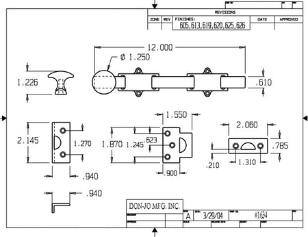 DON-JO 1634 Dutch Door Bolt, 12" x 1-5/8" Brass Material
