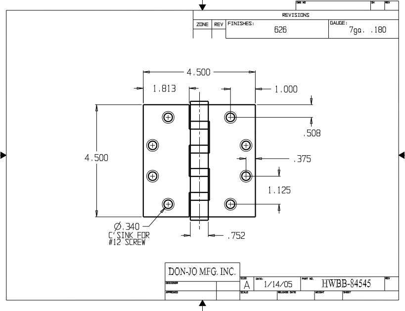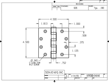 DON-JO HWBB84545 Heavy Weight 4 1/2" x 4 1/2", Brass Material, Satin Chrome Finish
