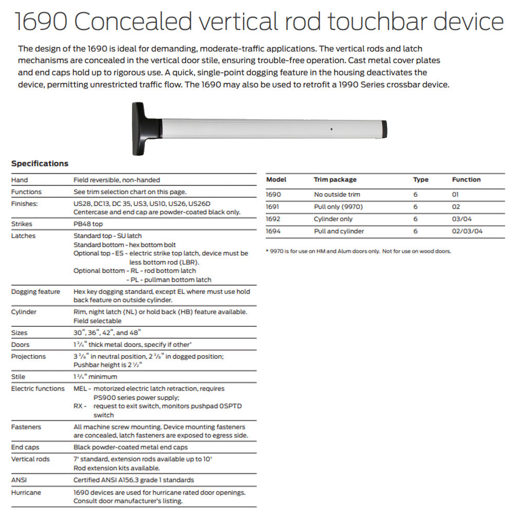 Falcon 1690 Concealed Vertical Rod Touch Bar Exit Device
