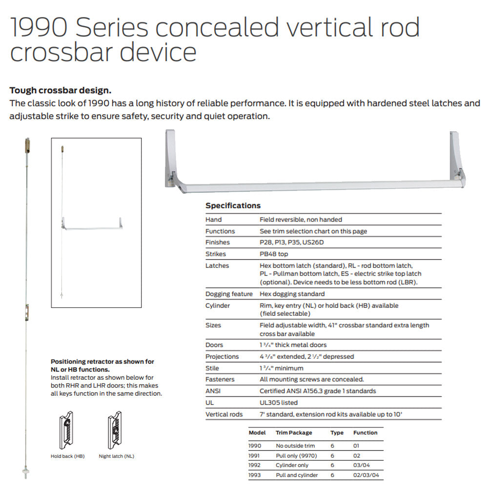 Falcon 1992-NLOP/HBOP Night Latch/Hold Back, Optional Pull, with Rim Cylinder Only - Concealed Vertical Rod Crossbar Exit Device