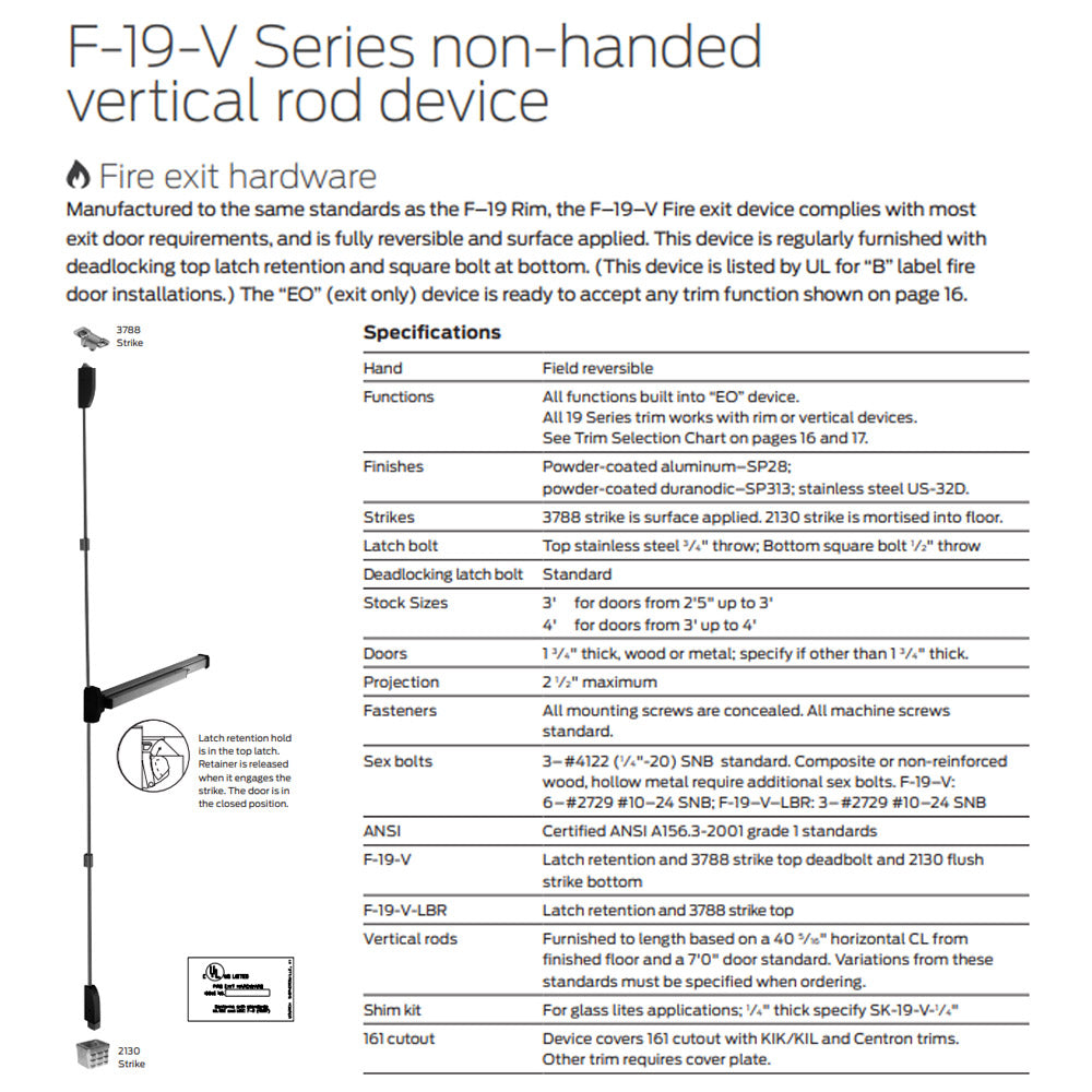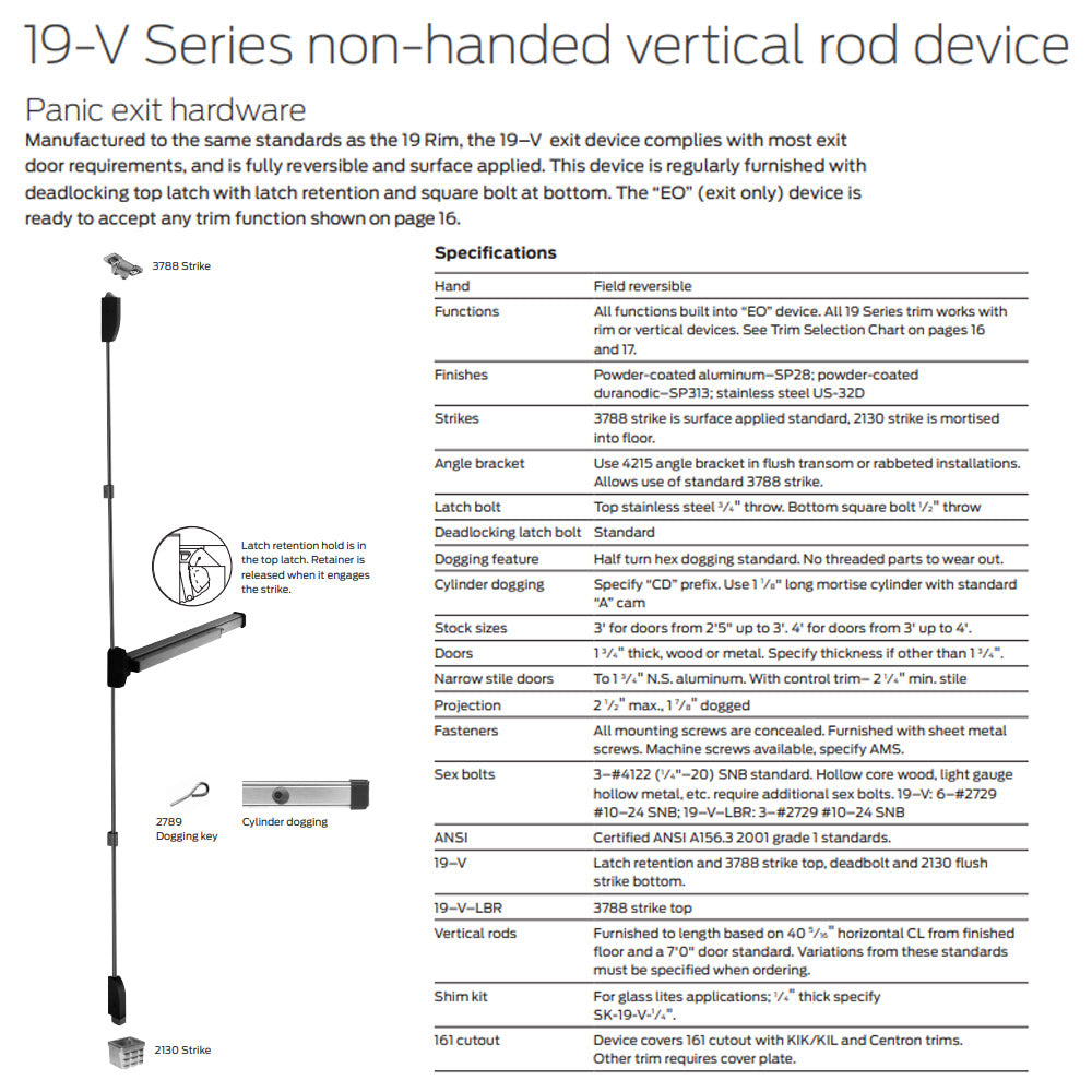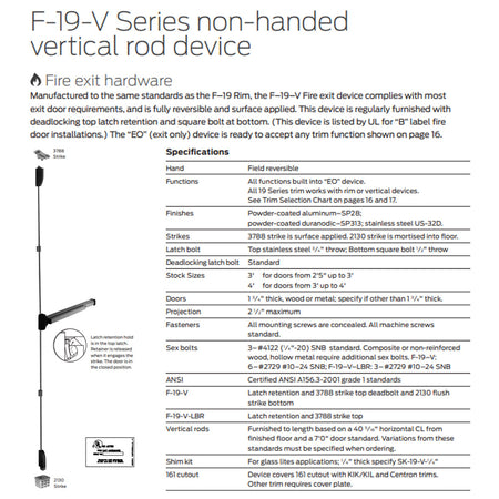 DESCRIPTION TAG: Falcon 19-V EO Reversible Vertical Rod Exit Device With Fire Option. Free Shipping on Orders Over $189. When low cost and dependability are essential, you can count on the Falcon 19 Series. The 19 Series is