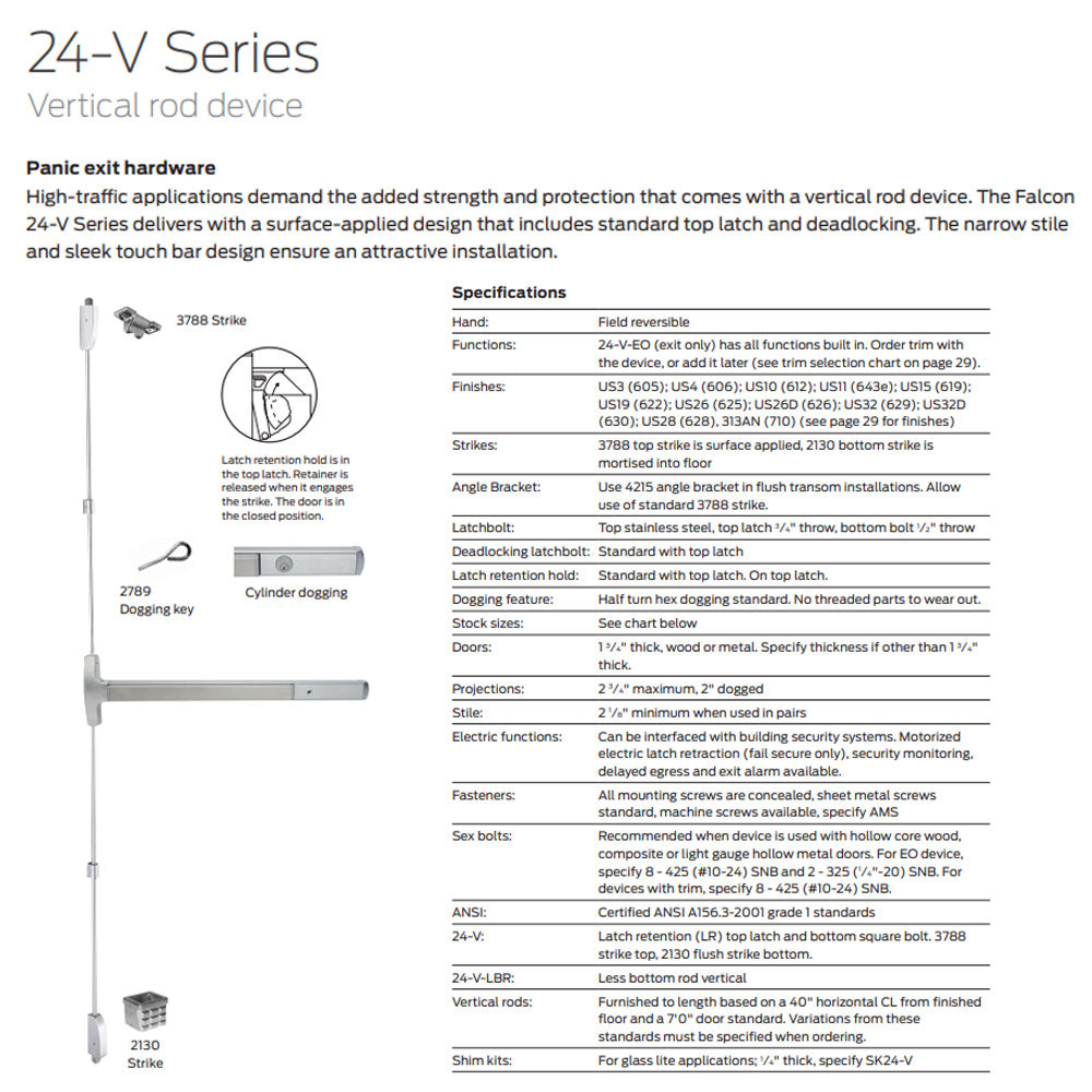 DESCRIPTION TAG: Falcon 24-Vertical EO Rod Exit Device. Free Shipping On Orders Over $189. Order Today! Panic exit hardware High-traffic applications demand the added strength and protection that comes with a vertical rod dev