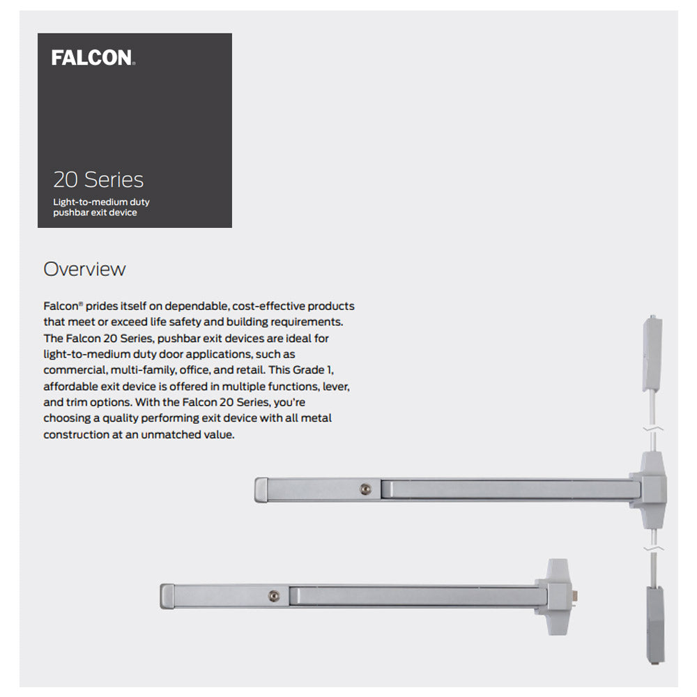 The Falcon 20 Series delivers exceptional value and performance for light-to-medium duty applications. Designed for reliability and affordability, this Grade 1 exit device is ideal for commercial buildings, multi-family housing, offices, and retail spaces. Built with an all-metal construction, it ensures long-lasting durability while maintaining a sleek and functional design.