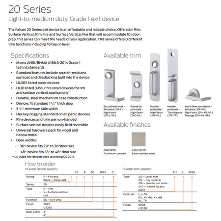 Available in Rim, Surface Vertical, Rim Fire, and Surface Vertical Fire configurations, the Falcon 20 Series is built to accommodate standard 161 door preps and offers multiple trim and function options to meet your specific door hardware needs.