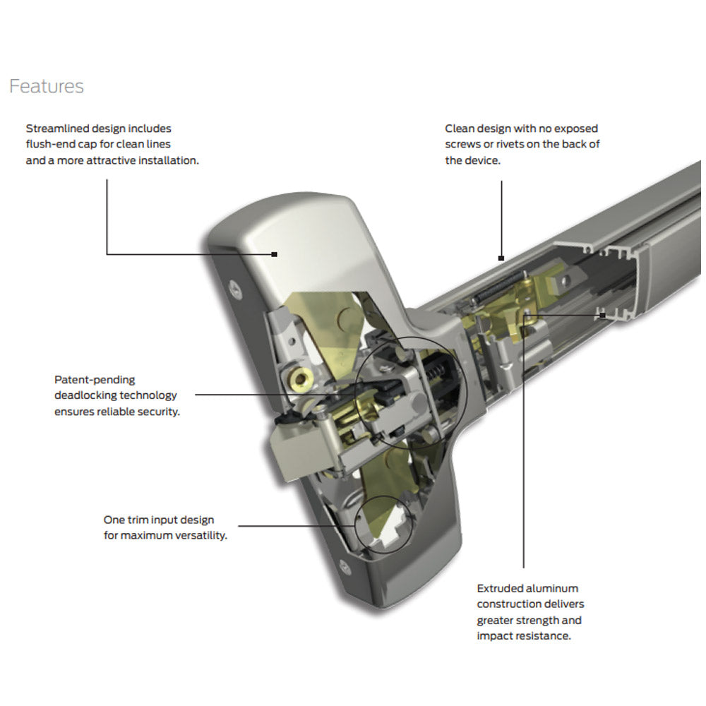 Constructed from extruded aluminum, the 24/25 Series delivers superior strength and impact resistance. The streamlined design eliminates exposed screws or rivets on the device’s back, providing a clean and attractive installation. A stainless steel push pad cover offers a scratch-resistant surface, while flush-end caps help protect against damage in demanding settings.