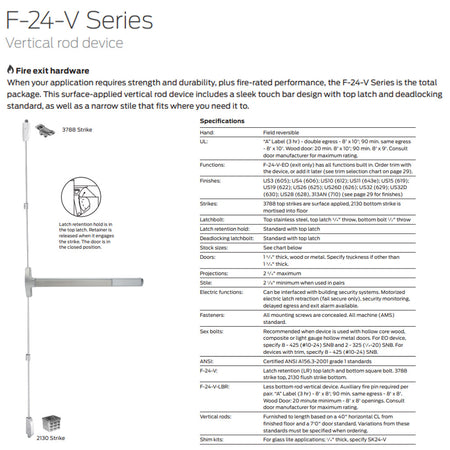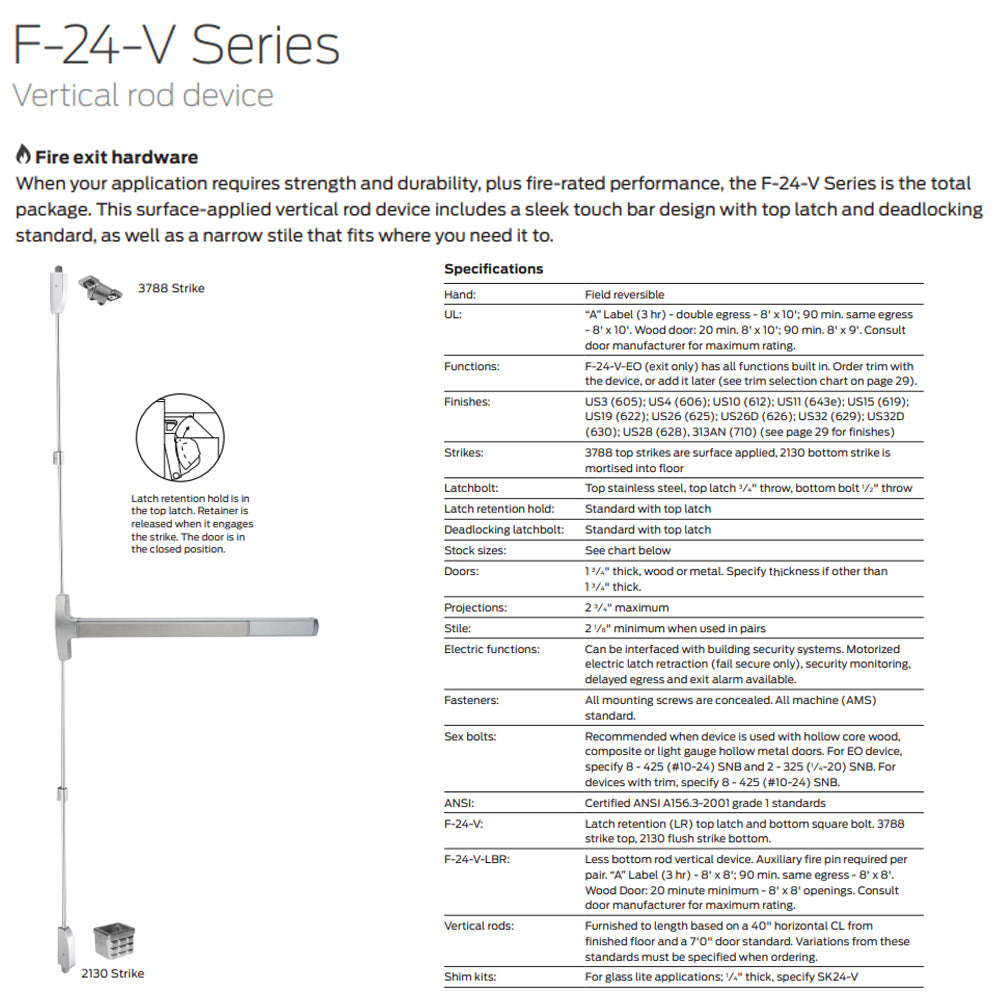 DESCRIPTION TAG: Falcon F-24-Vertical EO Fire Rated Rod Exit Device. Free Shipping On Orders Over $189. Order Today! Panic exit hardware High-traffic applications demand the added strength and protection that comes with a vertical rod dev