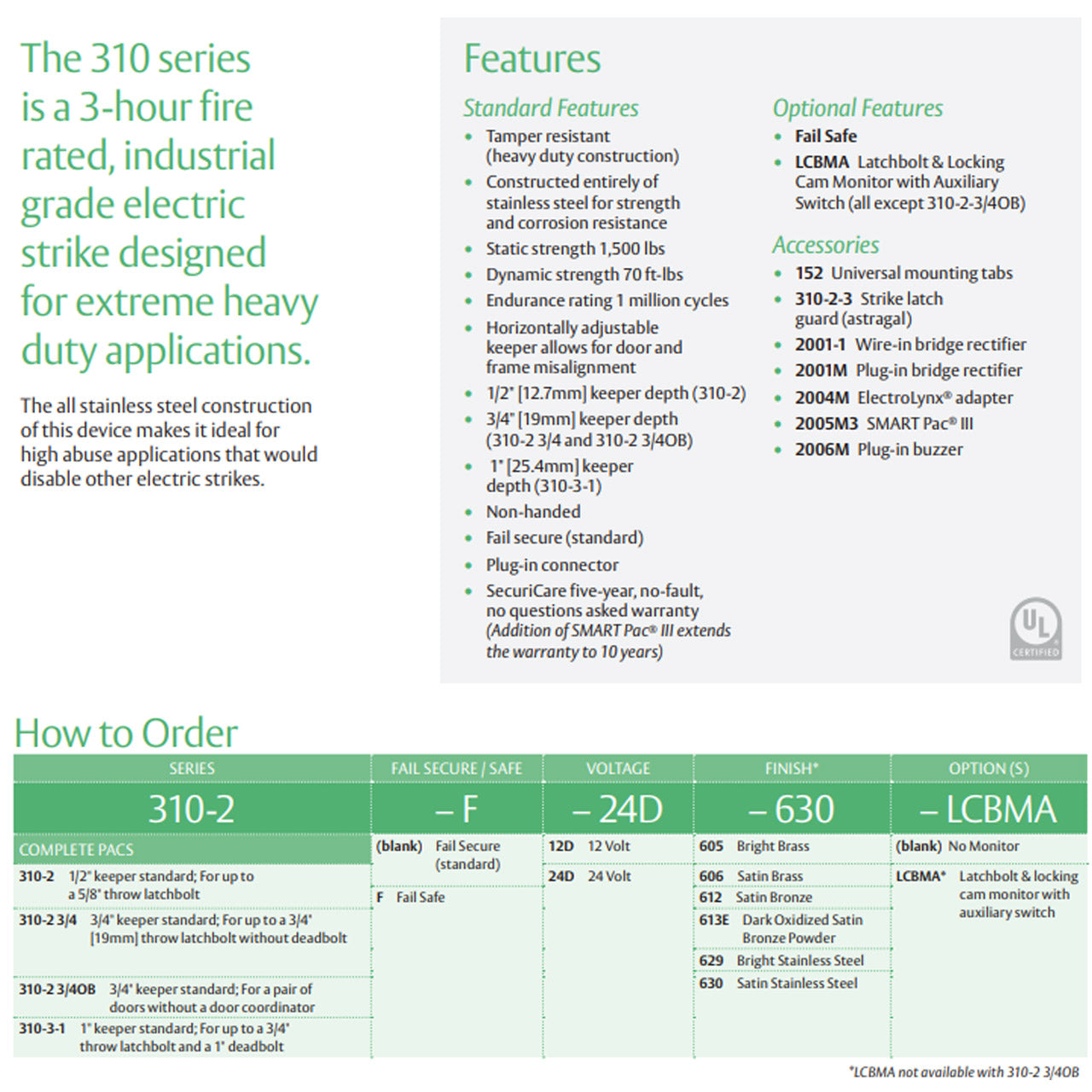 The 310 Series is a 3 hour fire-rated, industrial grade electric strike designed for extreme heavy duty applications. The all stainless steel construction of this device makes it ideal for high abuse applications that would disable other electric strikes.