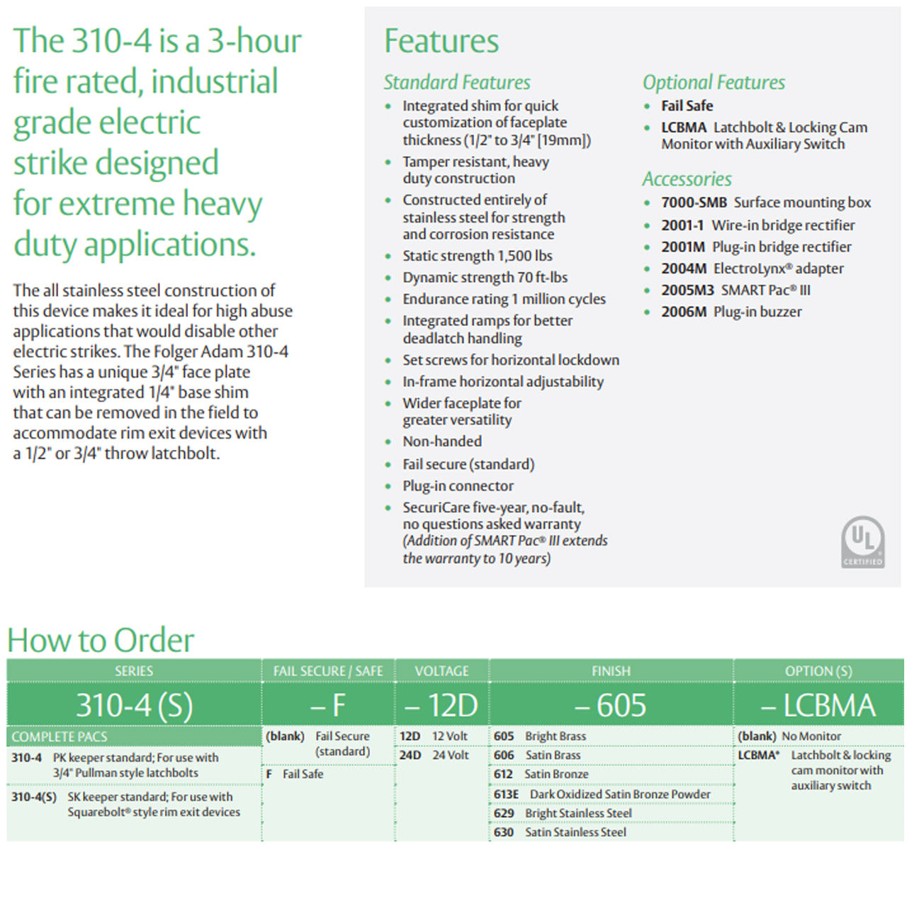 DESCRIPTION TAG: The 310-4 is a 3-hour fire rated, industrial grade electric strike designed for extreme heavy duty applications.