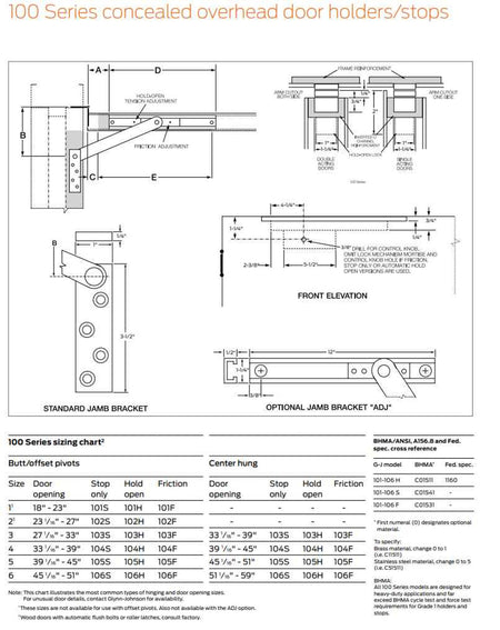 The 100 Series concealed holders and stops provide the most attractive and reliable heavy-duty door control available. They are designed for installation on virtually all types of doors mounted on conventional type butt hinges, pivots, continuous hinges, swing clear hinges and numerous other specialty hinges. When used in conjunction with many surface-applied door closers, the 100 Series holders and stops provide the most effective control for entrance doors and vestibule doors of all types, as well as heavy or often-used interior doors. The provided templates allow for variable mounting positions, ranging from 85° - 110° of opening.