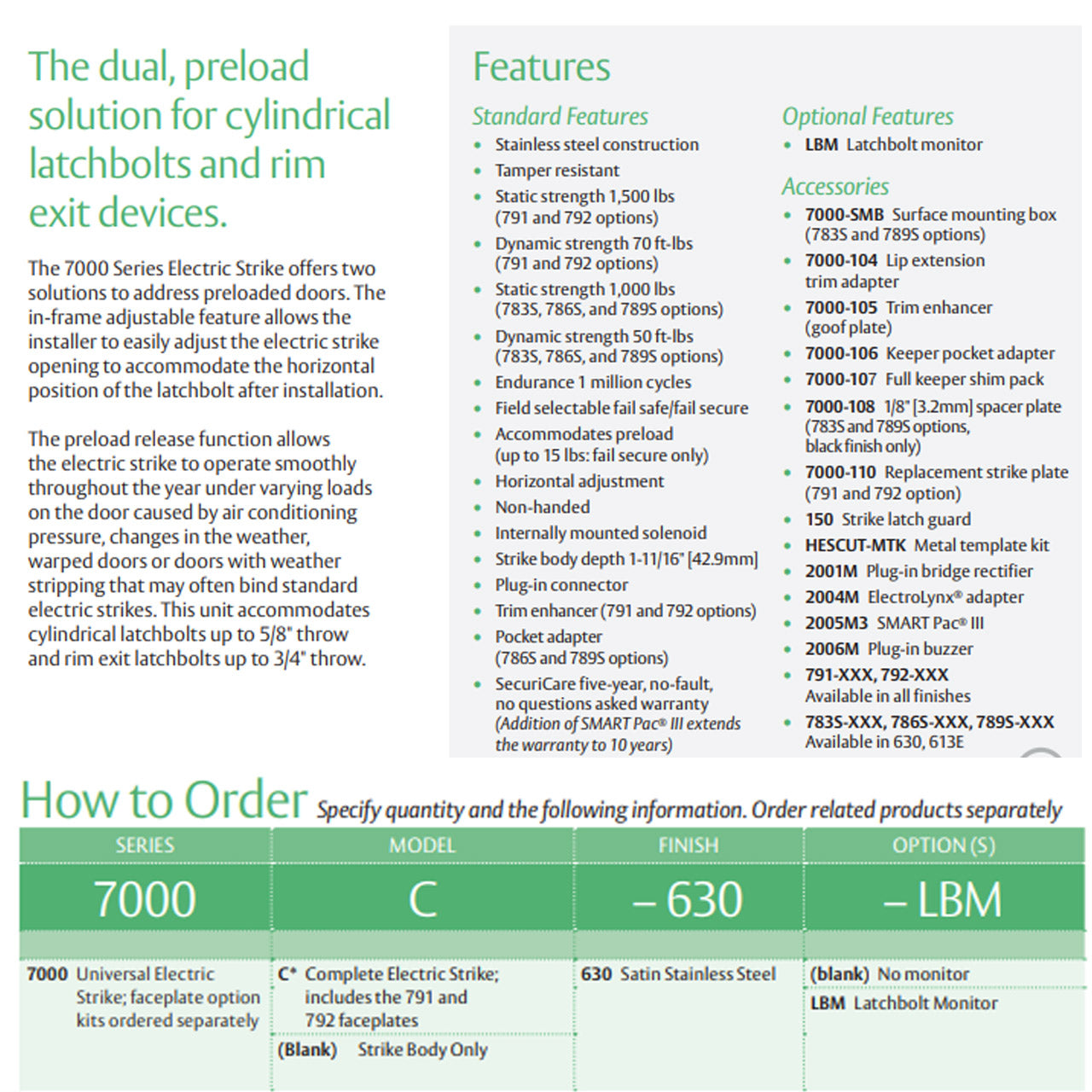 DESCRIPTION TAG: Hes 7000 Series Electric Strike. US Lock Supply Stocks The 7000 Series In All Finishes & Options. Free Shipping On Orders Over $189. Specifications UL 1034, burglary-resistant listed UL 294 (6th