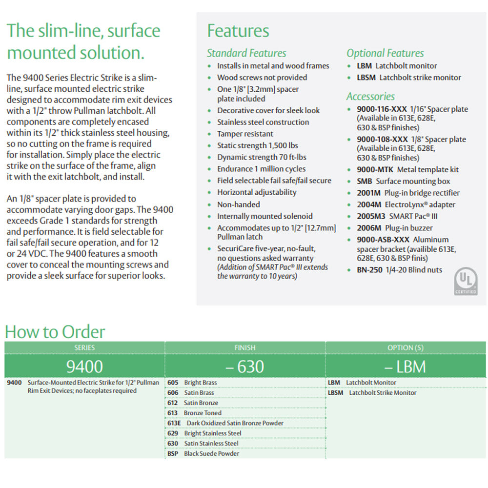 The 9400 series is a slim-line, surface mounted electric strike designed to accommodate rim exit devices with a 1/2" Pullman latch. All components are completely encased within its 1/2" thick stainless steel housing, so no cutting on the frame is required for installation. Simply place the electric strike on the surface of the frame, align it with the exit latchbolt, and install.