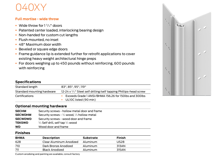 - All hinges are certified to ANSI 156.26, Grade 1, and UL10C (90 minute)