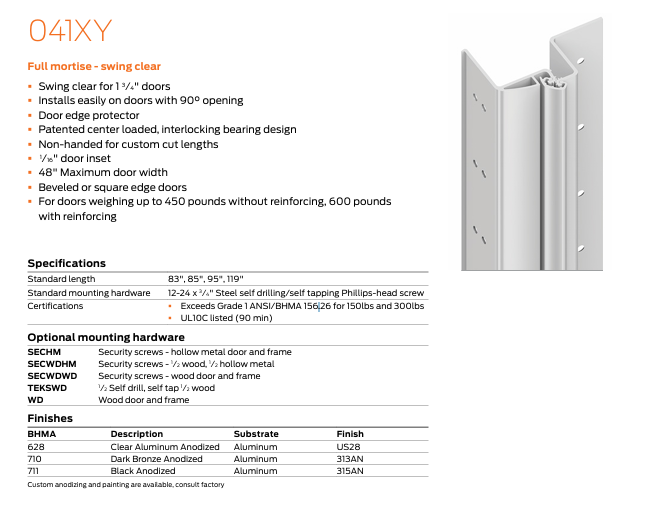 - Full surface, swing clear: hinge is mounted on the door stile face and the frame side jamb face; the entire hinge is visible when the door is closed; the geared section is located over the side jamb. Offering includes the following model: 210XY.