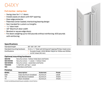 - All hinges are certified to ANSI 156.26, Grade 1, and UL10C (90 minute)
