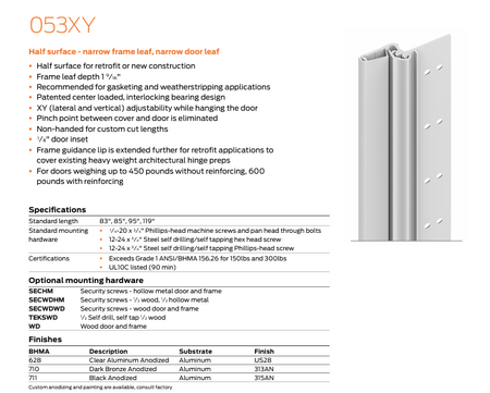 - All hinges are certified to ANSI 156.26, Grade 1, and UL10C (90 minute)