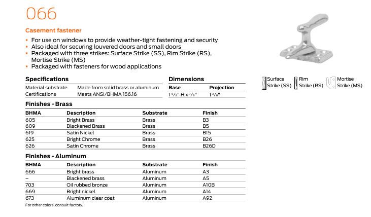 - Packaged with three strikes: Surface Strike (SS) Rim Strike (RS) Mortise Strike (MS);