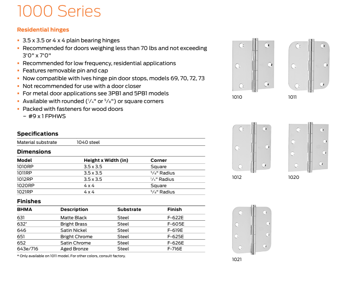 Ives offers a variety of architectural hinges, also known as butt hinges, that will cover any need in residential and commercial applications while also exceeding code requirements. It is important to consider the door width, thickness, weight and clearance when choosing a hinge. With tested durability and consistent superior performance, Ives architectural hinges get the job done.