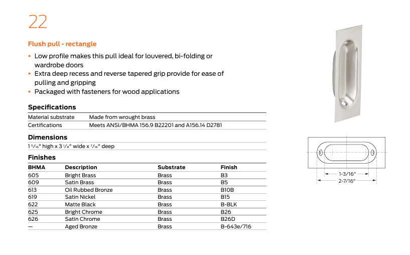 • Flush pulls help maximize the space-saving benefits derived from installing sliding and pocket doors. The flush pull line has high-quality pulls with upscale appearances that improve the look and feel of an interior sliding or pocket door design. Whether standard or decorative flush pulls are needed, Ives offers various finishes, shapes, and sizes for any application.