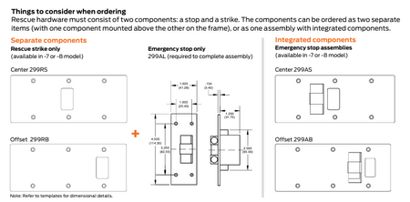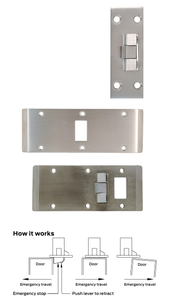 Used in conjunction with center hung pivots, rescue hardware allows a bi-directional door swing in emergency situations. When a patient becomes trapped behind an inward swinging door, the center tong of the emergency stop depresses allowing the door to swing in the opposite direction without causing damage to the frame.