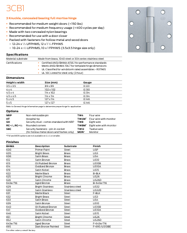 - Meets ANSI/BHMA 156.7 for template hinge dimensions
