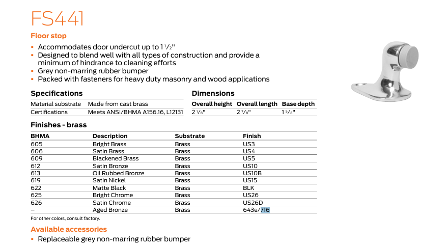 With a full line of wall bumpers, wall holders, kick down holders and hinge pin stops, Ives products are designed to ensure that doors will not slam into the wall. These accessories are typically found on doors without an overhead stop or holder.