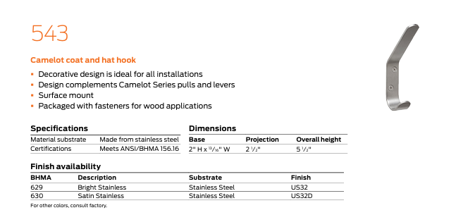 - Hooks: various hook styles and finishes that complete any office, resident or personal interior door for hanging coats and hats.