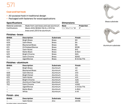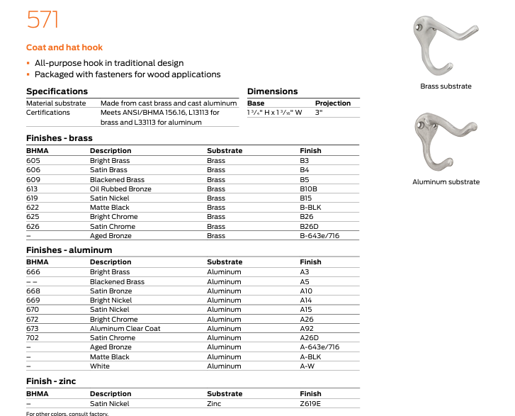 • Hooks: various hook styles and finishes that complete any office, residential, or personal interior door for hanging coats and hats.